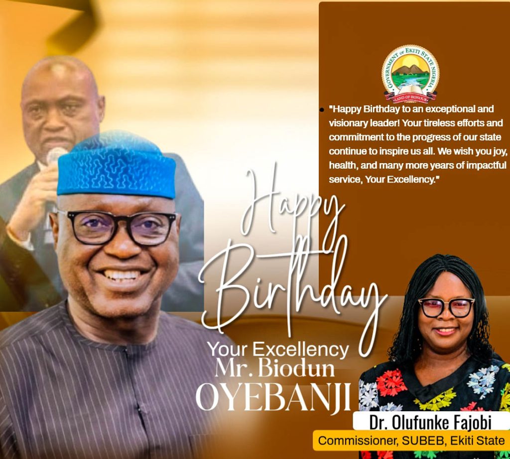 The Commissioner for Human Resources Management in Ekiti State Universal Basic Education Board(SUBEB), Dr. Olufunke Fajobi, has extended heartfelt felicitations to Governor Biodun Abayomi Oyebanjii on the occasion of his 58th birthday, commending his exemplary leadership and unwavering commitment to the progress of Ekiti.