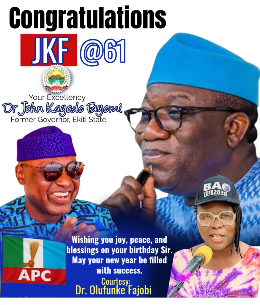 Dr. Olufunke Fajobi, the Commissioner, Human Resources Management in Ekiti State Universal Basic Education Board(SUBEB) has extended warm felicitations to former Ekiti State Governor and Minister of Mines and Steel Development, Dr. Kayode Fayemi(JKF) on the occasion of his 61st birthday.