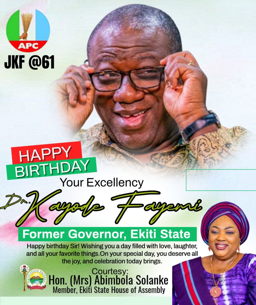 A member of Ekiti State House of Assembly Member, representing Moba Constituency 1, Hon. (Mrs) Abimbola Solanke has congratulated a former Governor of Ekiti State, Chairman of the Nigeria Governors Forum(NGF) and former minister of Mines and Steel Development, His Excellency Dr. Kayode Fayemi (JKF), on the occasion of his 61st birthday.