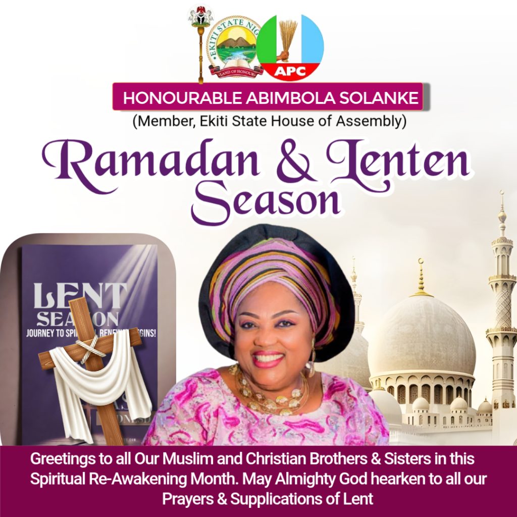 A member of the Ekiti State House of Assembly representing Moba constituency One, Honourable (Mrs) Abimbola Solanke has congratulated Muslims and Christians in her constituency, Ekiti State and Nigeria at large on the commencement of the 2026 Ramadan fast and Lenten season.