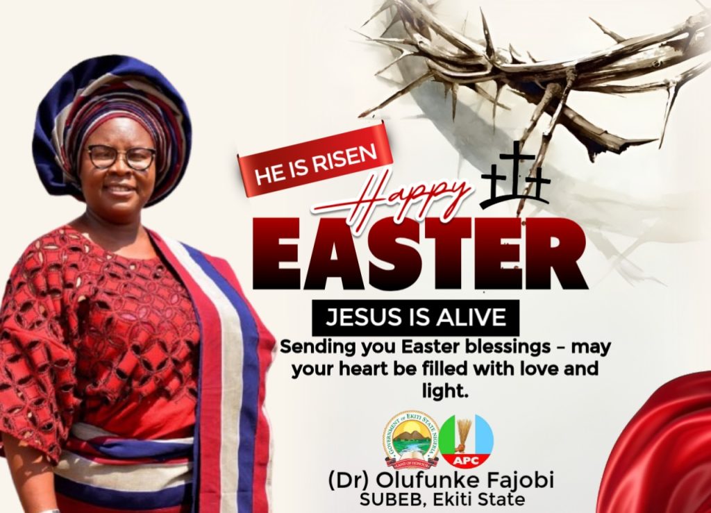 The Commissioner in charge of Human Resources in the Ekiti State Universal Basic Education Board(SUBEB), Dr. Olufunke Fajobi has congratulated all Christian faithful in Ikere Ekiti, Ekiti State and beyond on the successful completion of the Lenten season and the celebration of Easter that marked the crucifixions and resurrection of Jesus Christ on the cross at Calvary.
